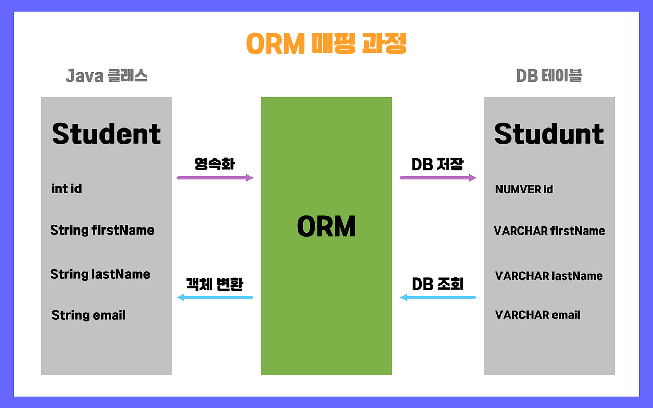 - 개발자가 객체지향 프로그래밍 언어에서 사용하는 객체 모델과 관계형 데이터베이스 테이블 간의 매핑을 자동으로 처리해줌
