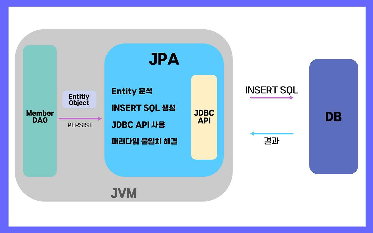 - `jpa.persist(member)` → `Insert SQL` 문 자동 생성 ⇒ DB에 저장