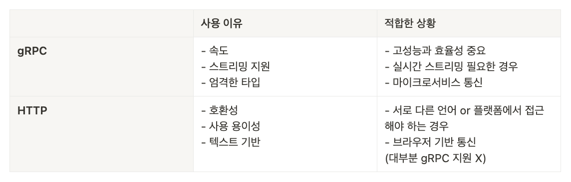 - protobuf라는 바이너리 직렬화 방식 사용 → JSON or XML 같은 텍스트 기반 포맷에 비해 데이터 전송 속도 빠름