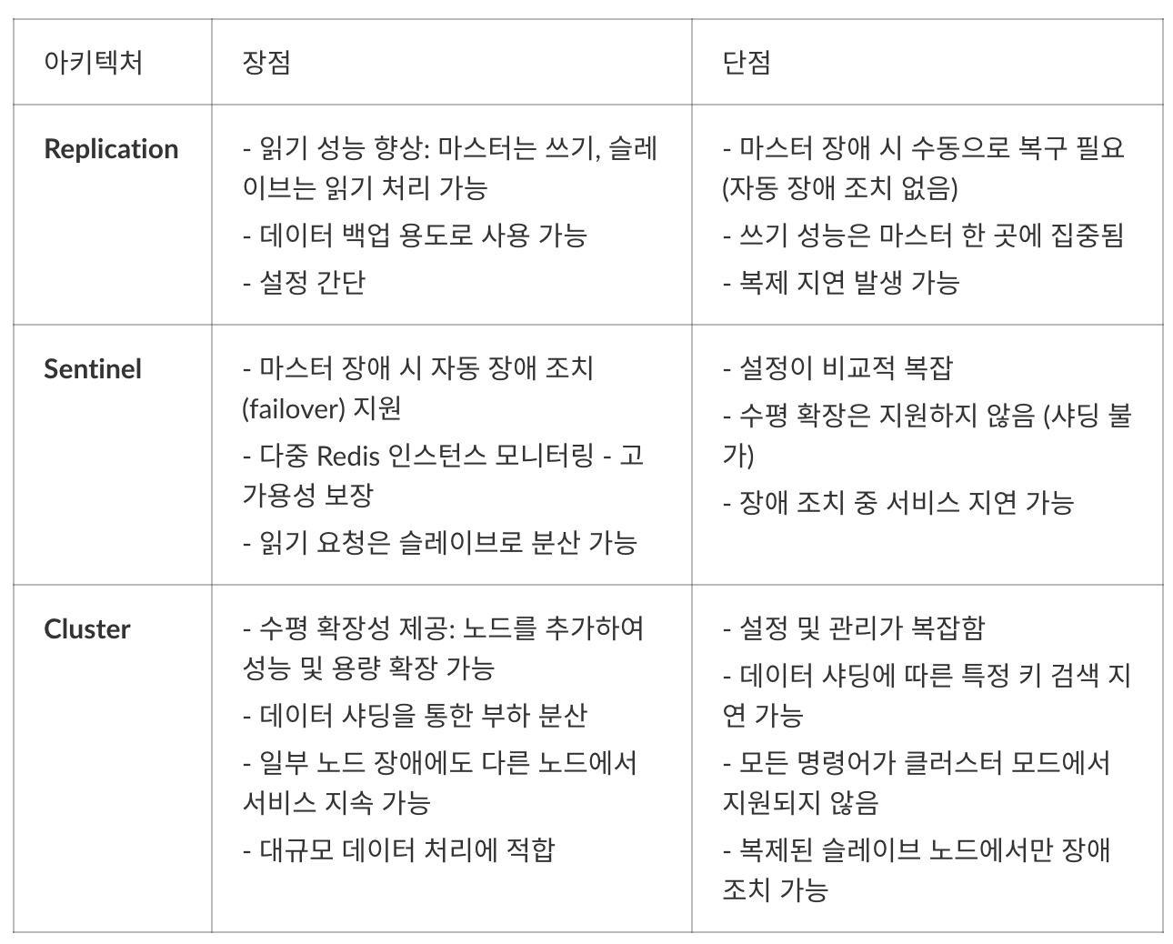 - (-) 마스터 장애 시 수동 복구가 필요하며, 쓰기 성능은 제한적