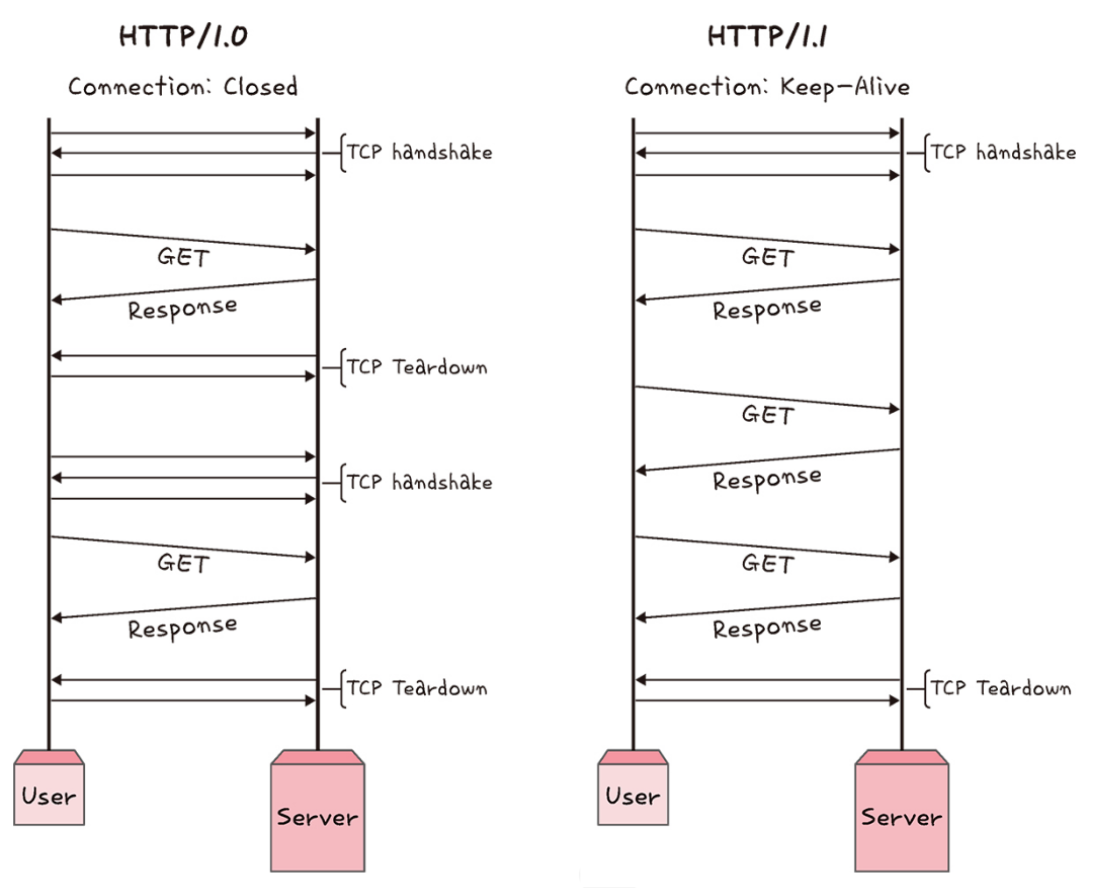 (HTTP/1.0에도 keep-alive O But, 표준화 X) - 한 번 TCP 3-way handshake 발생 -> 그 다음부터 발생 X