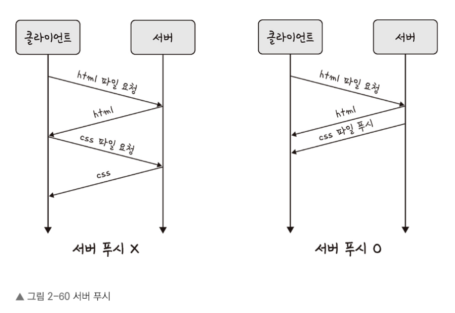 - html을 읽으면서 그 안에 들어 있던 css 파일을 서버에서 푸시해 클라이언트에 먼저 줄 수 있음