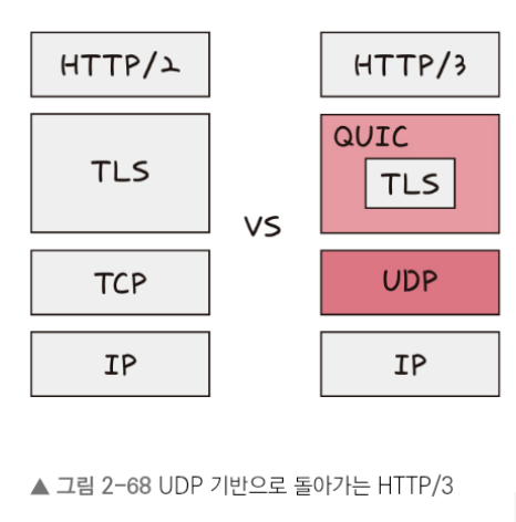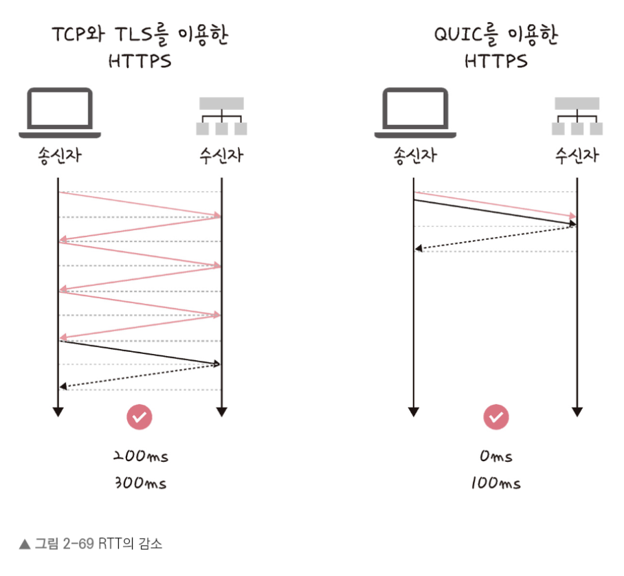 - QUIC: TCP 사용 X -> 통신을 시작할 때 번거로운 3-way handshake 과정 X