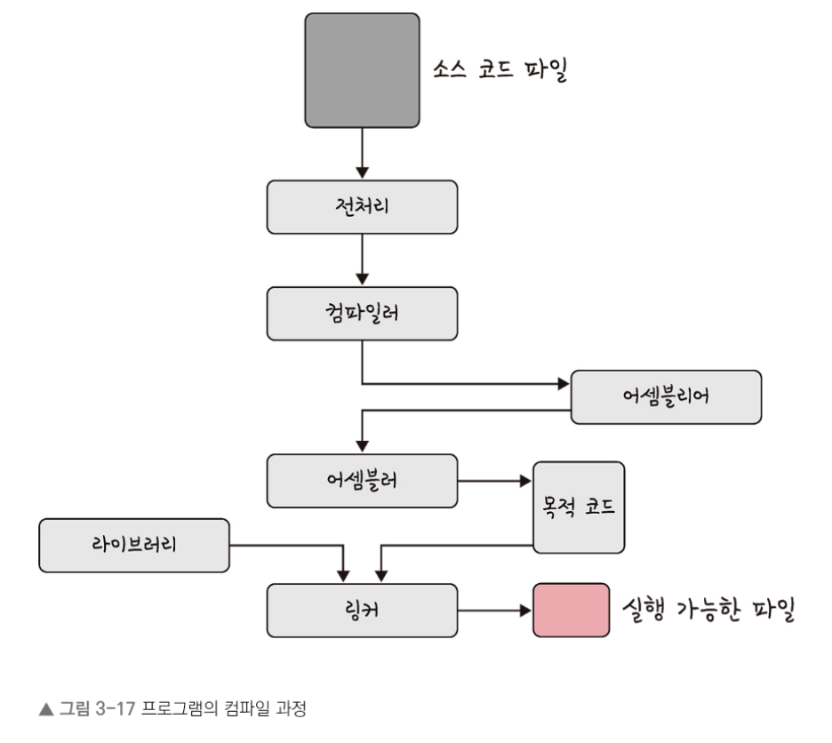 - 링커: 프로그램 내에 있는 라이브러리 함수 or 다른 파일들과 목적 코드 결합하여 실행 파일 만듦