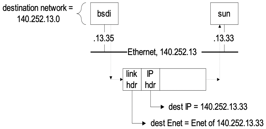 bsdi(140.252.13.35)에서 sun(140.252.13.33)으로 IP datagram을 보내는 경우