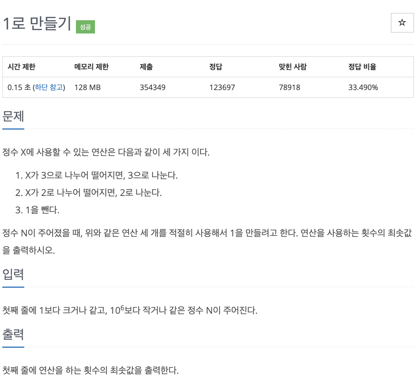 => 정수 N이 주어졌을 때, 연산 세 개 적절히 사용해서 1을 만들려고 함