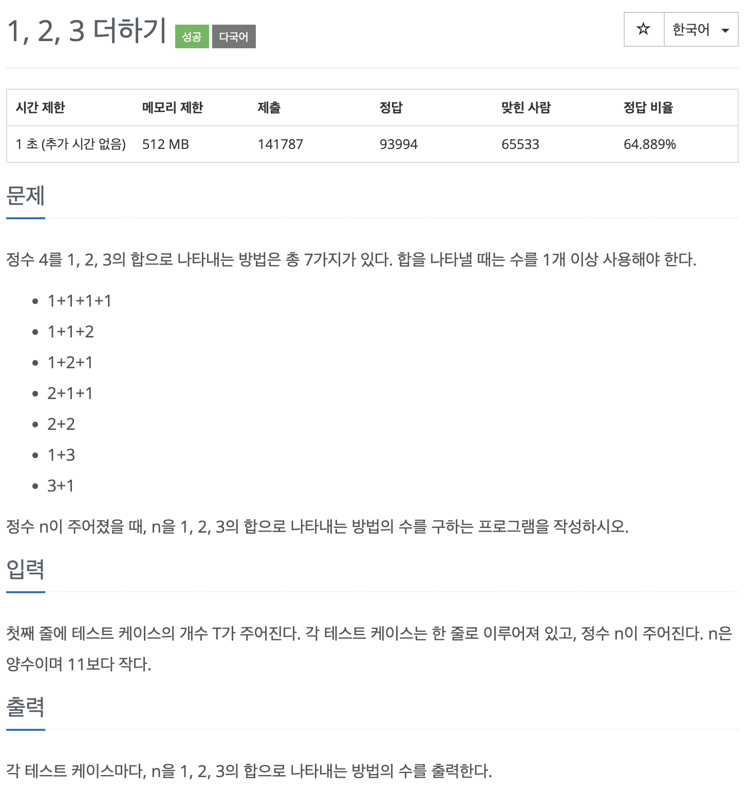 => 정수 n이 주어졌을 때 n을 1, 2, 3의 합으로 나타내는 방법의 수