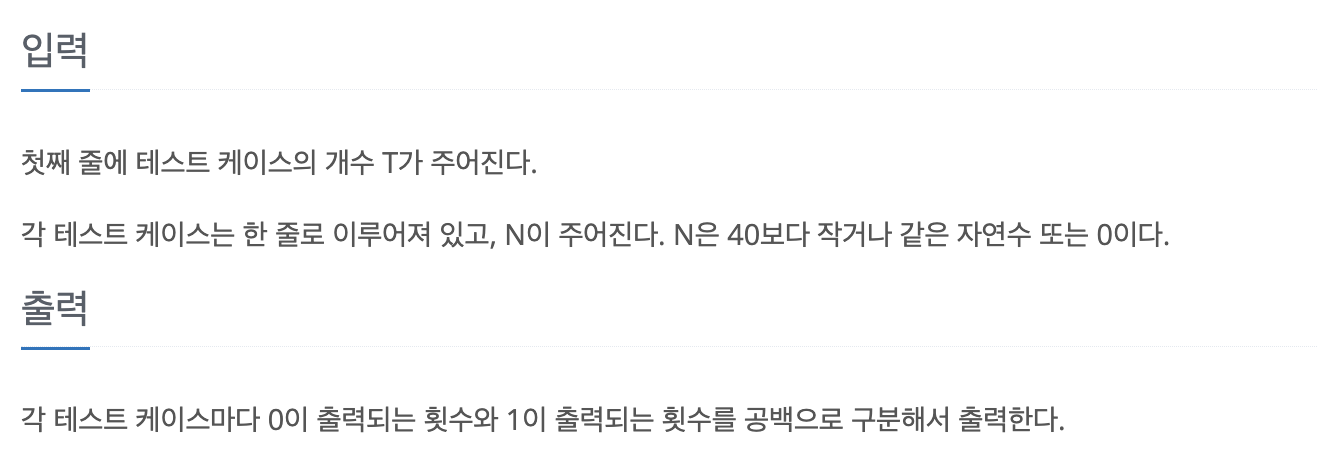 => N이 주어졌을 때, fibo(n) 호출했을 때 0과 1이 각각 몇 번 출력?