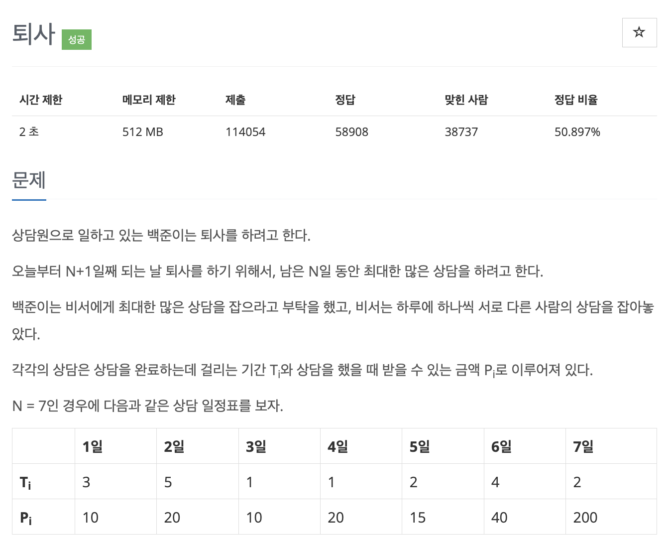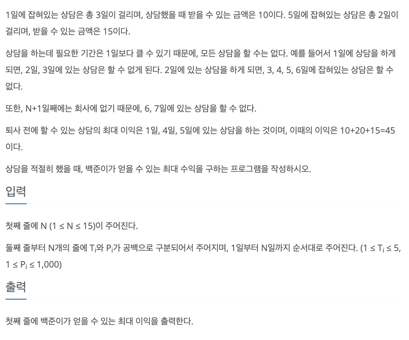 N + 1일째 되는 날 퇴사를 하기 위해서, 남은 N일 동안 최대한 많은 상담