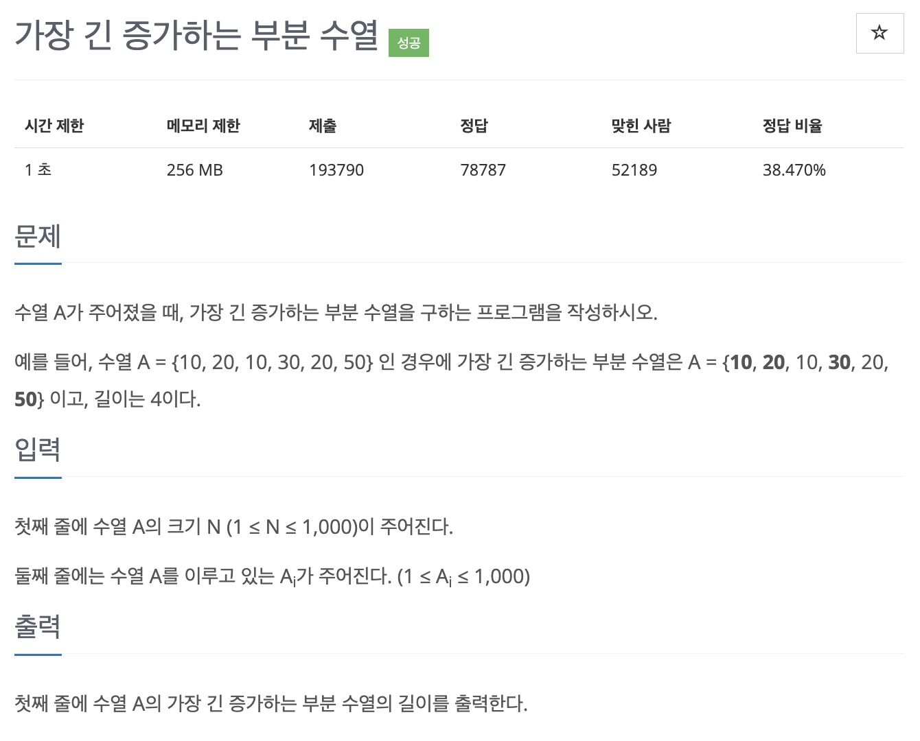 - `dp[j]`: A[0] ~ A[j]까지 LIS 길이/ A[i]를 붙이면 -> `dp[j] + 1`