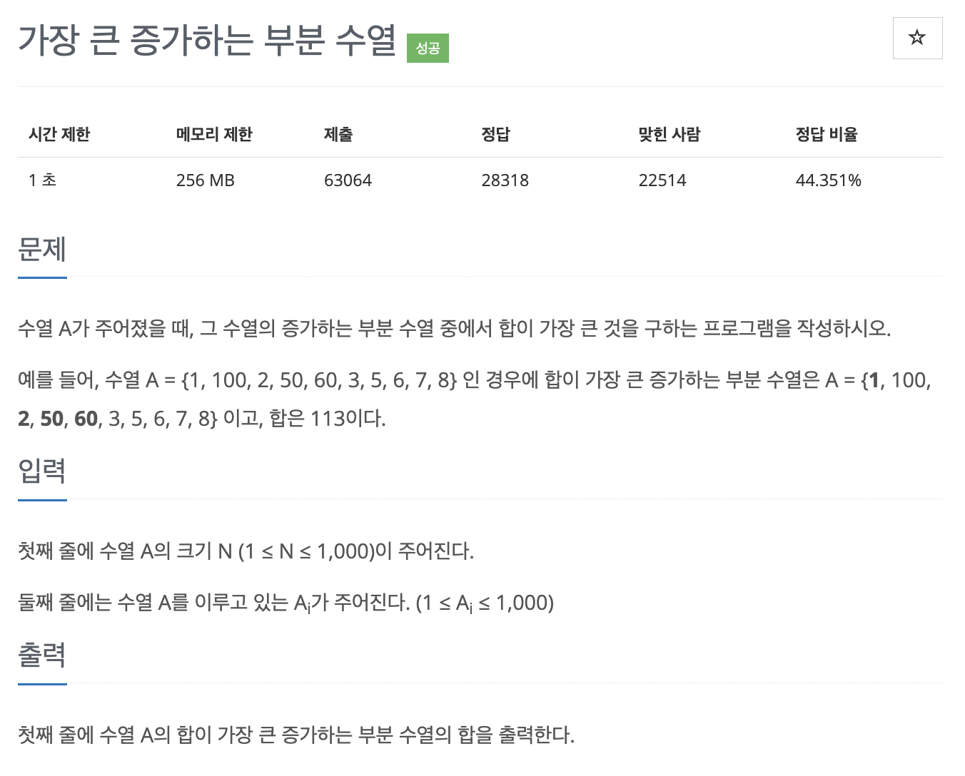 => 수열 A가 주어졌을 때, 그 수열의 증가하는 부분 수열 중에서 합이 가장 큰 것 ?