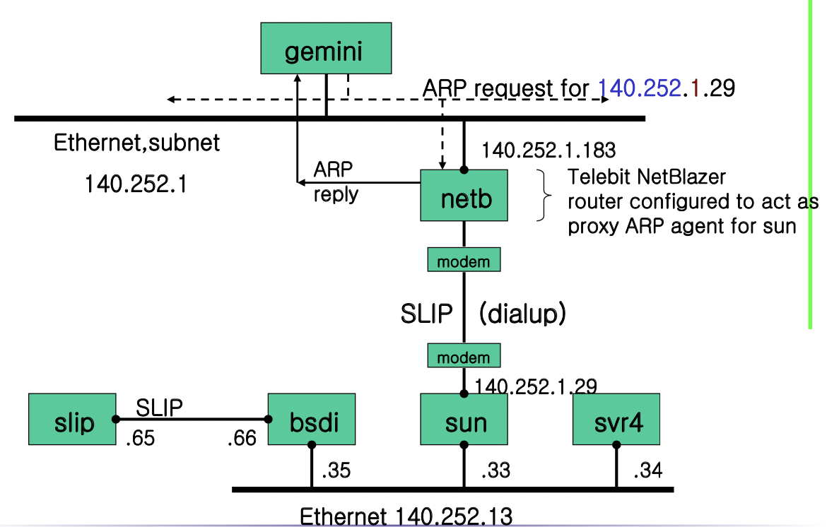 라우터가 프록시 ARP 대행자(agent)로 동작 -> 같은 네트워크 ID를 갖는 두 물리 네트워크가 존재할 수 있게 함