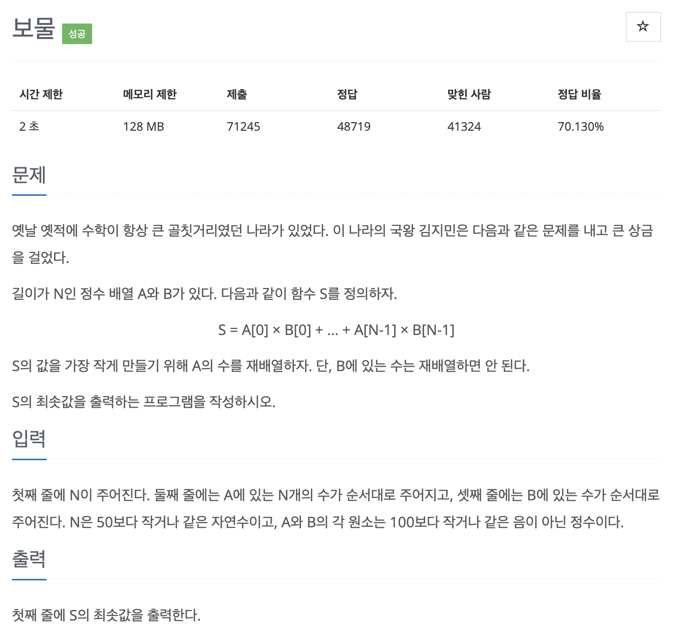S의 값을 가장 작게 만들기 위해 A의 수를 재배열