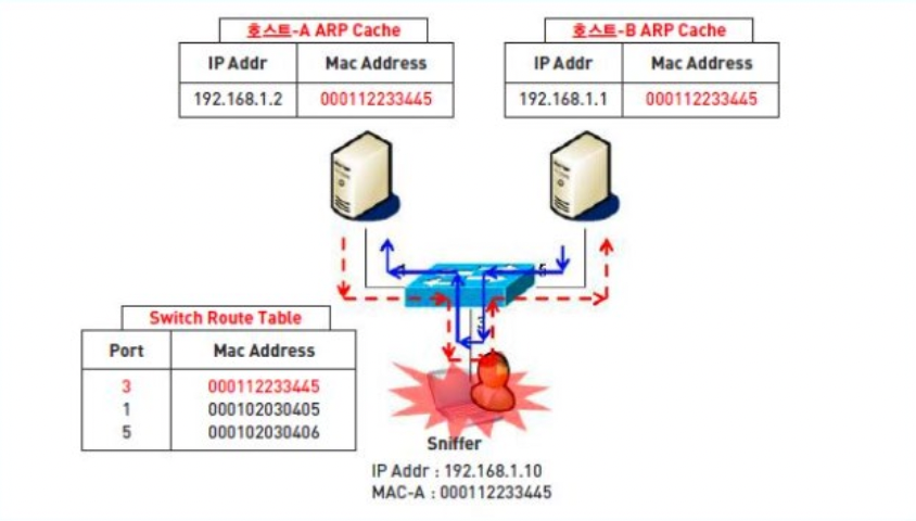 호스트가 MAC 주소 임의 변경 + 랜카드 재기동 -> 근거 없는 ARP 회람