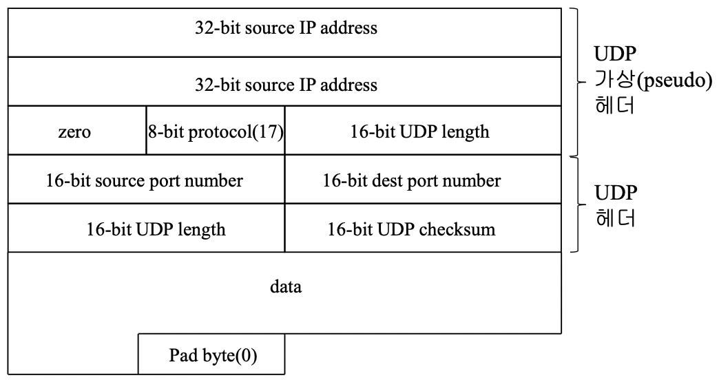 ㄴUDP 데이터그램 크기 = 홀수 바이트 -> 0으로 채운 1바이트 패딩 추가