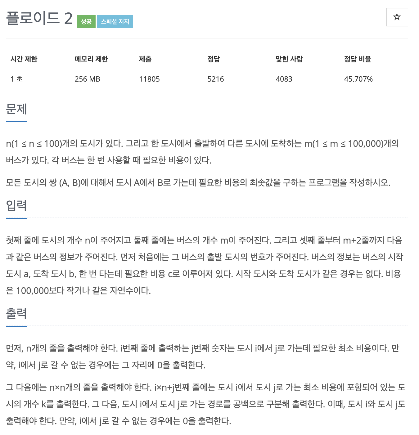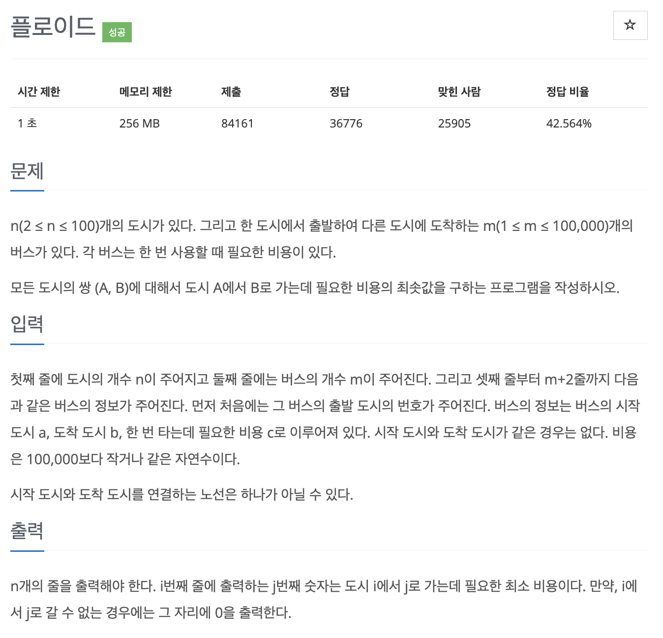 모든 도시 쌍 (a, b)에 대해 도시 a에서 b로 가는데 필요한 비용의 최솟값