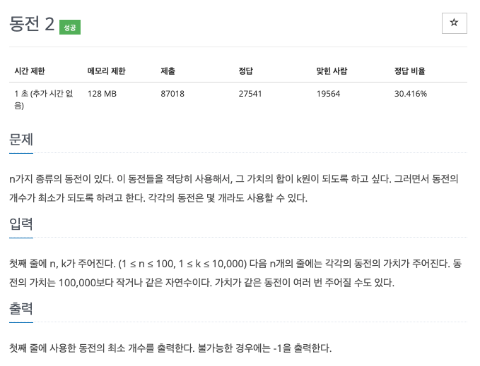 동전을 적당히 사용해서, 그 가치의 합이 k원이 되도록 하고 싶음
