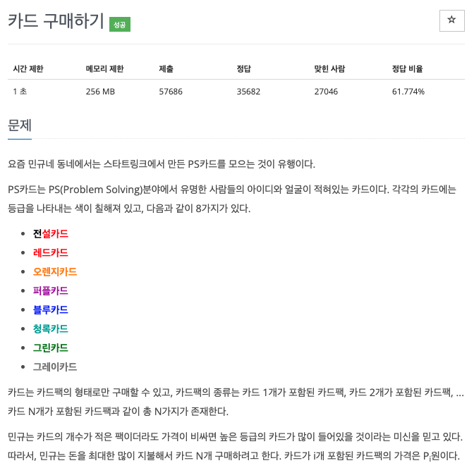 카드는 카드팩의 형태로만 구매, 종류는 1개 ~ N개가 포함된 카드팩까지 총 N가지