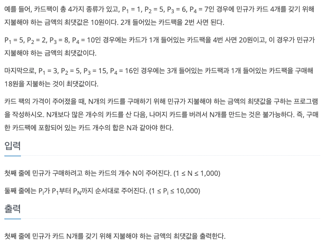 -> 카드 4개를 갖기 위해 지불해야 하는 금액의 최솟값: 4원 (1개 들어있는 카드팩 4번)