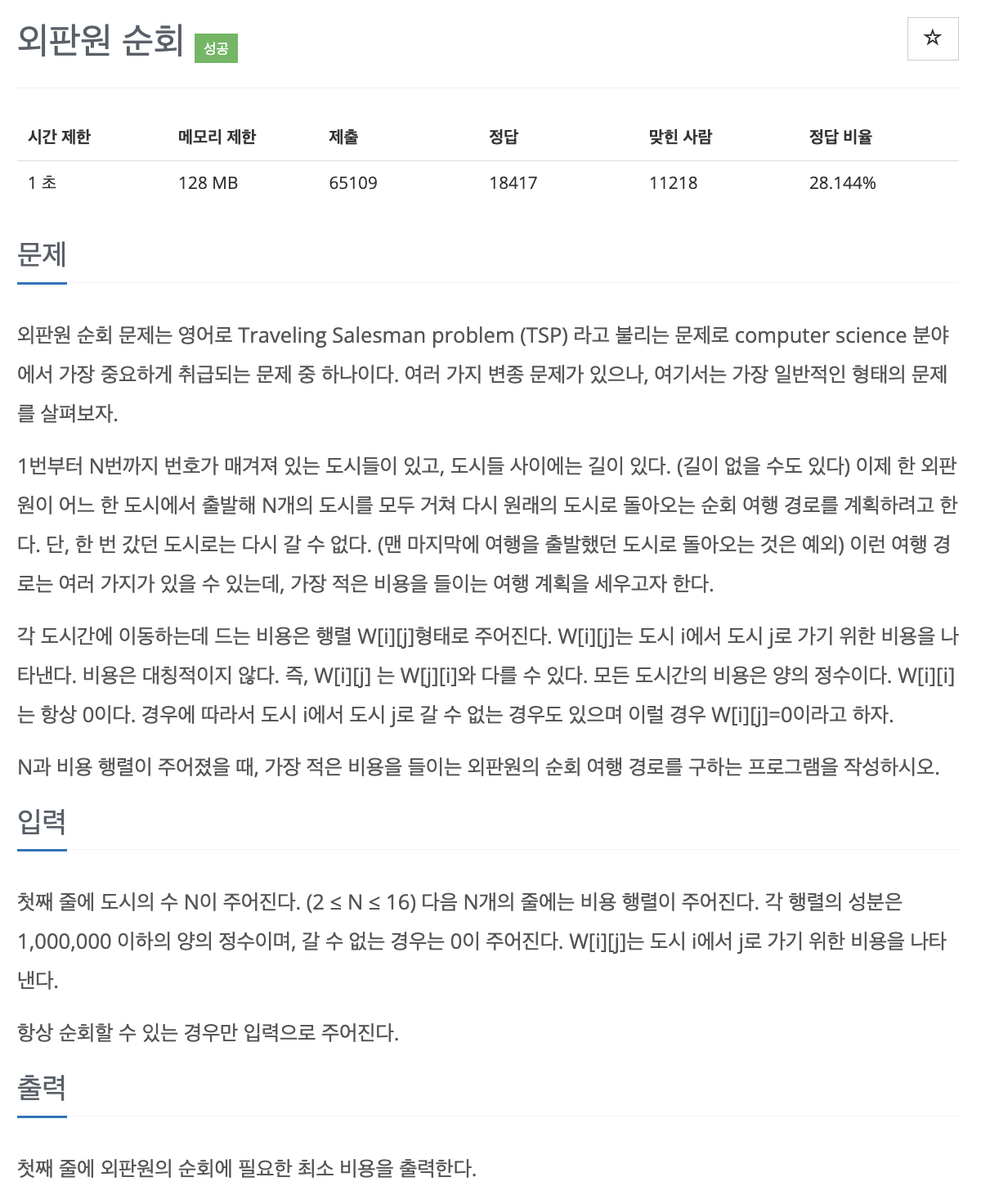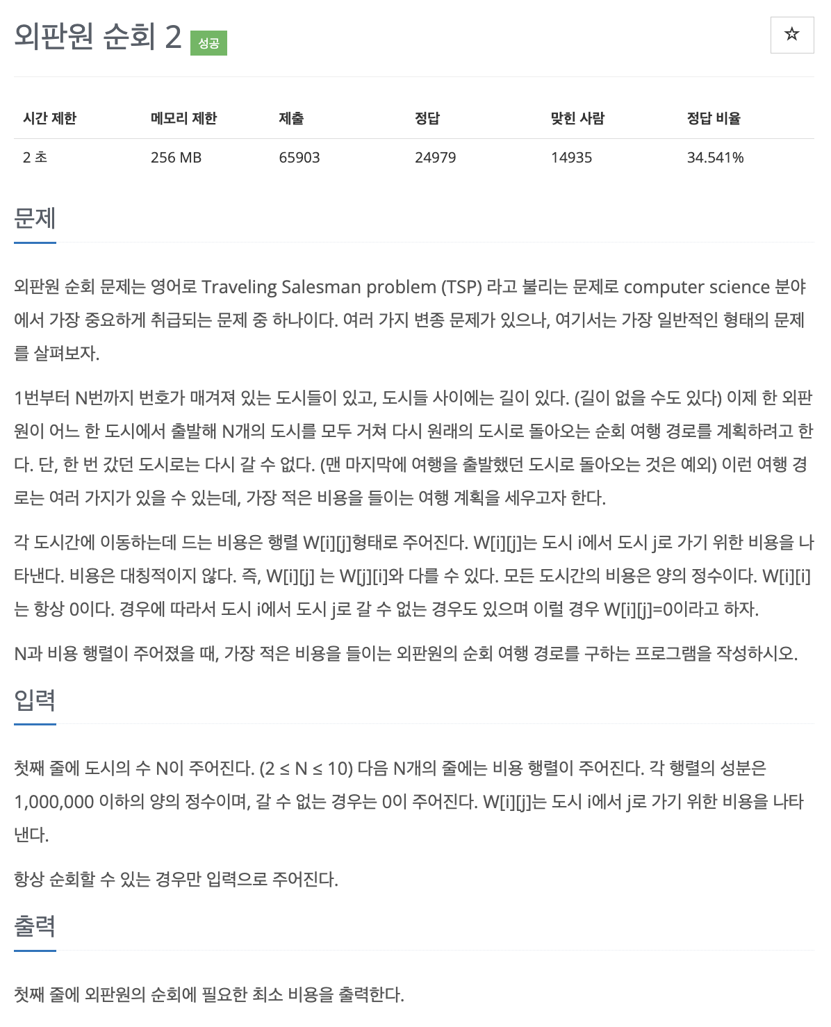 한 외판원이 어느 한 도시에서 출발해 N개의 도시를 모두 거쳐 다시 원래의 도시로 돌아오는 순회 여행 경로를 계획하려고 한다