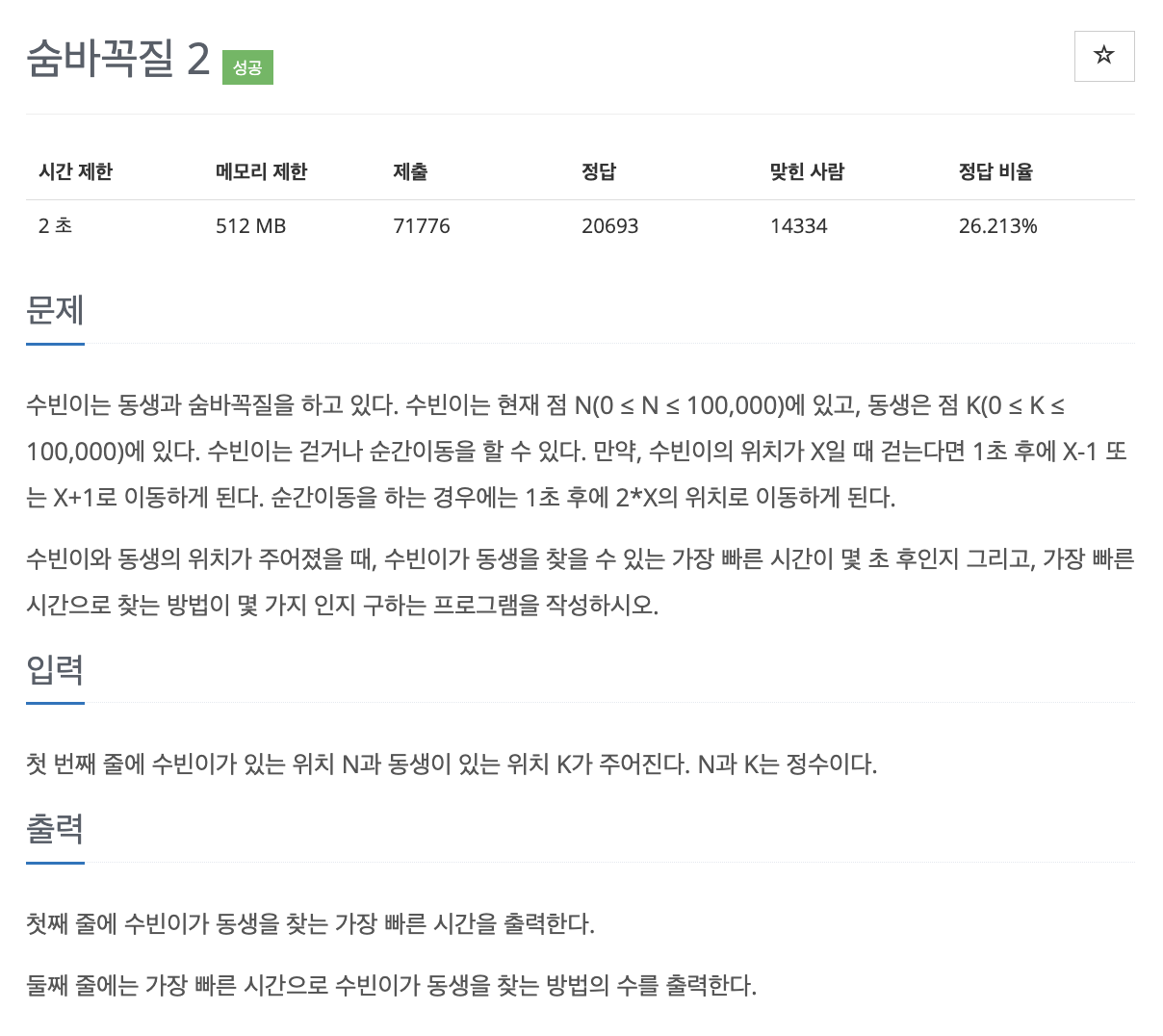 => 수빈이와 동생의 위치가 주어졌을 때, 수빈이가 동생을 찾을 수 있는 가장 빠른 시간이 몇 초 후인지 구하는 프로그램
