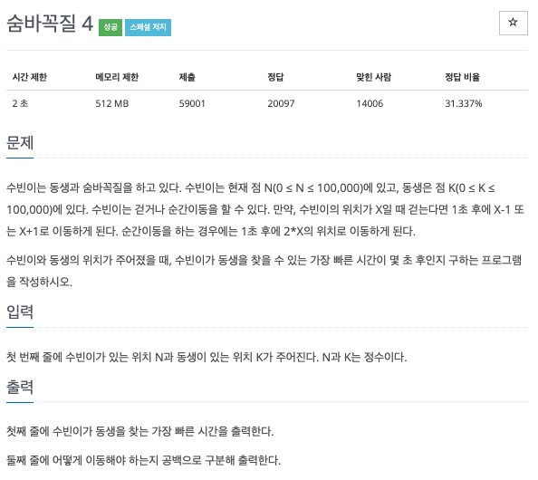 수빈이는 동생과 숨바꼭질을 하고 있다. 수빈: 현재 점 N에 있고, 동생은 점 K에 있다.