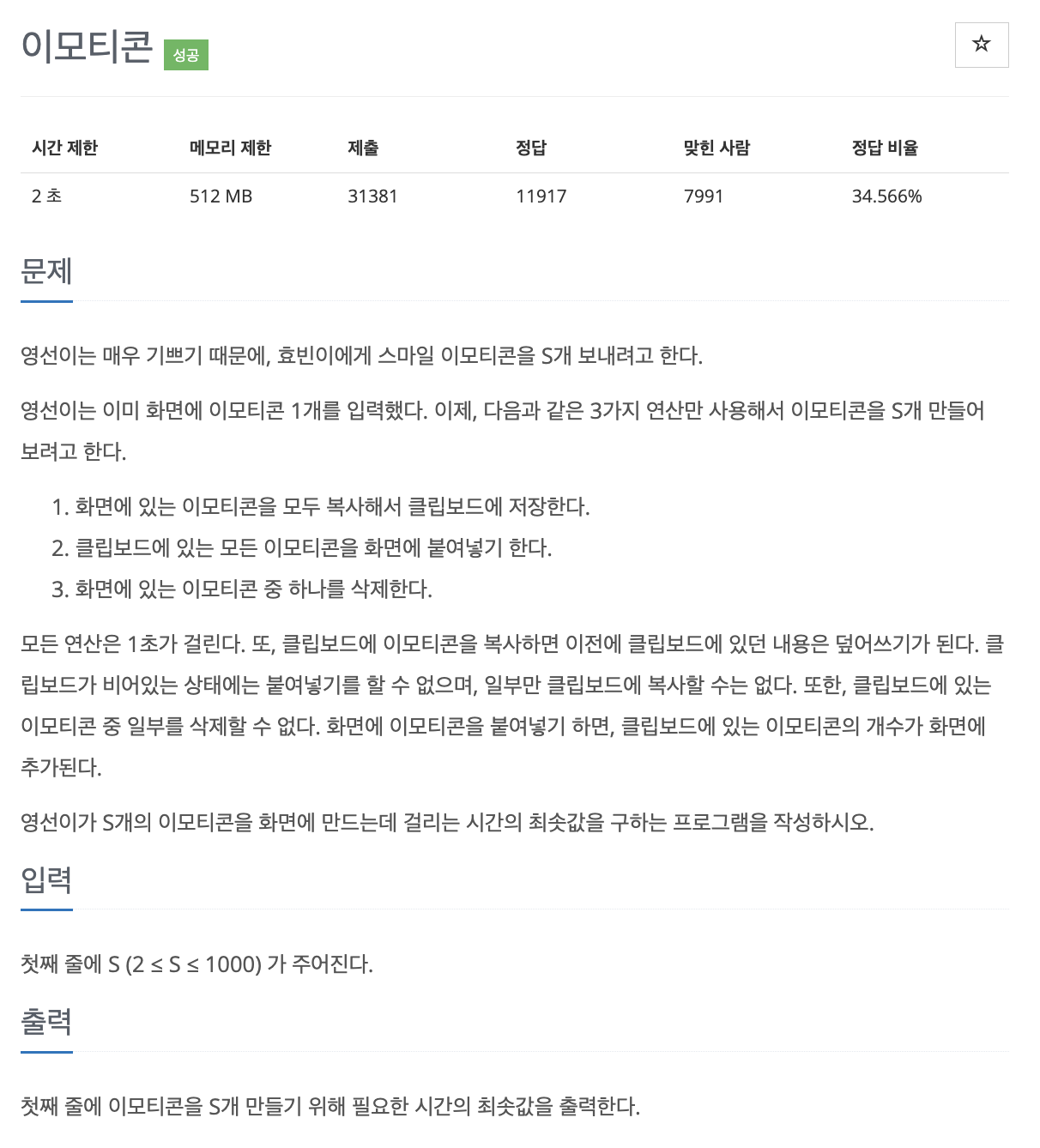 출력: 이모티콘 S를 만들기 위해 필요한 시간의 최솟값