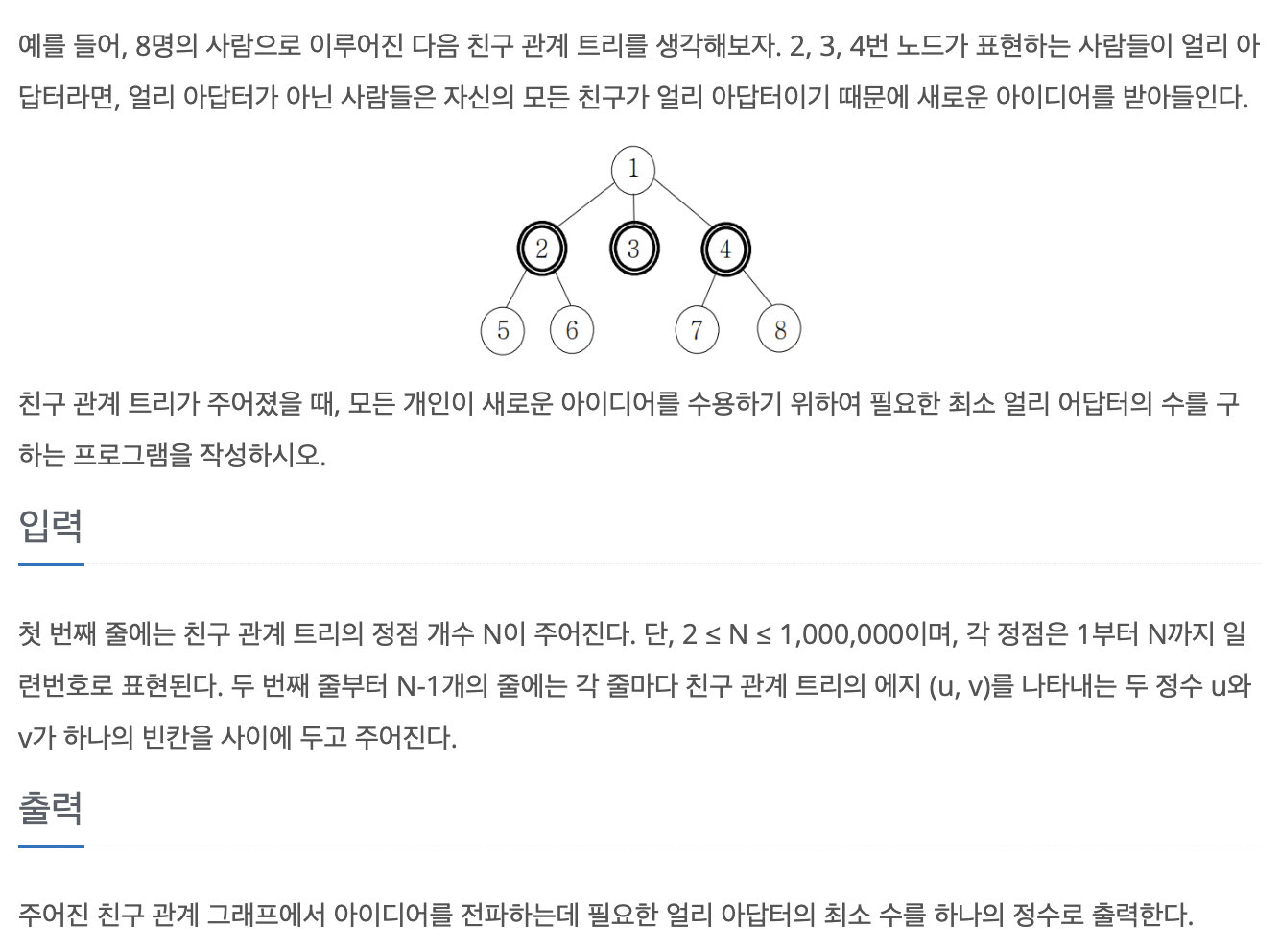 => 친구 관계 트리가 주어졌을 때 모든 개인이 새로운 아이디어를 수용하기 위해 필요한 최소 얼리 어답터 수?