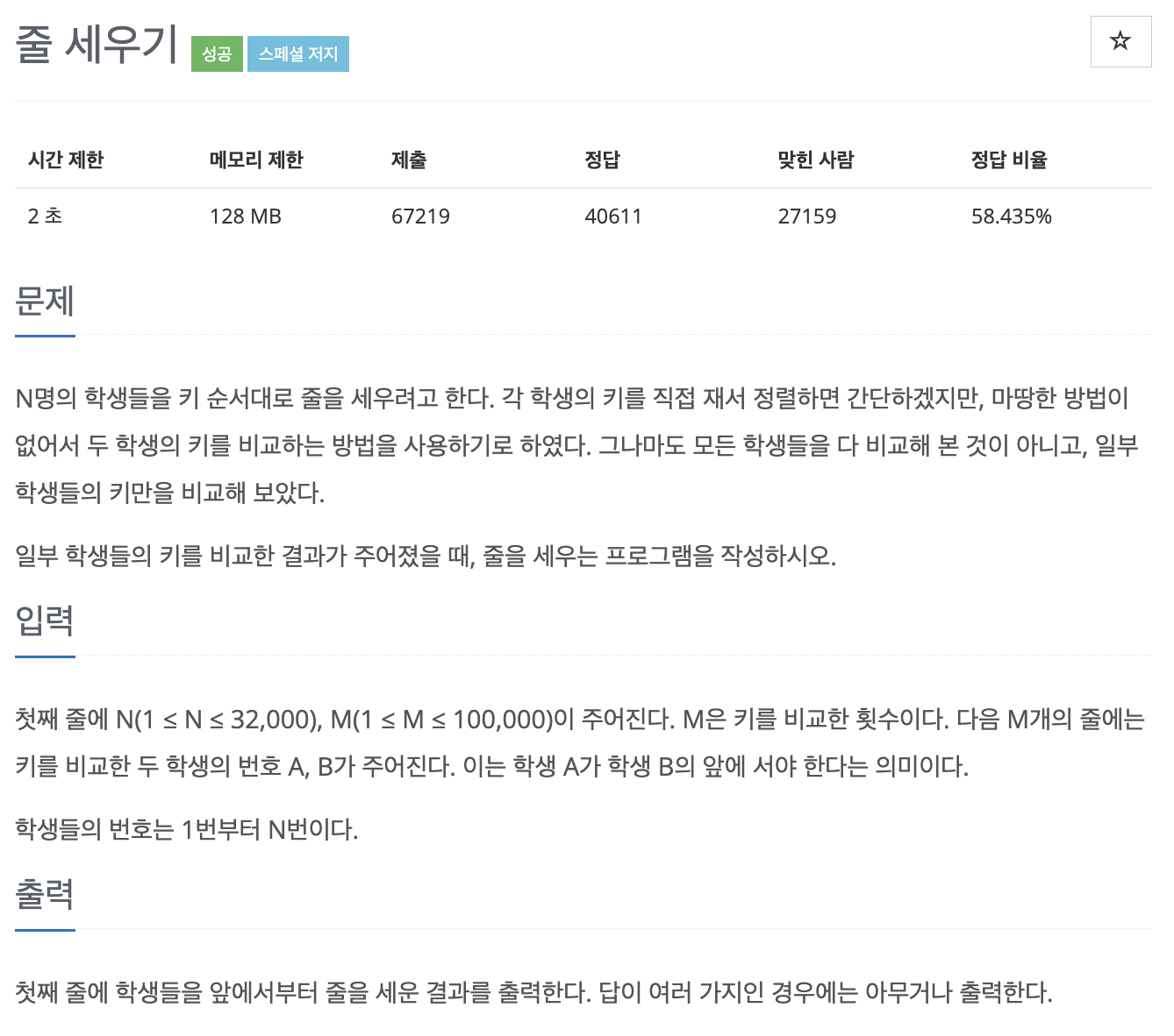 출력: 학생들을 앞에서부터 줄을 세운 결과(답 여러 가지인 경우 아무거나 출력)