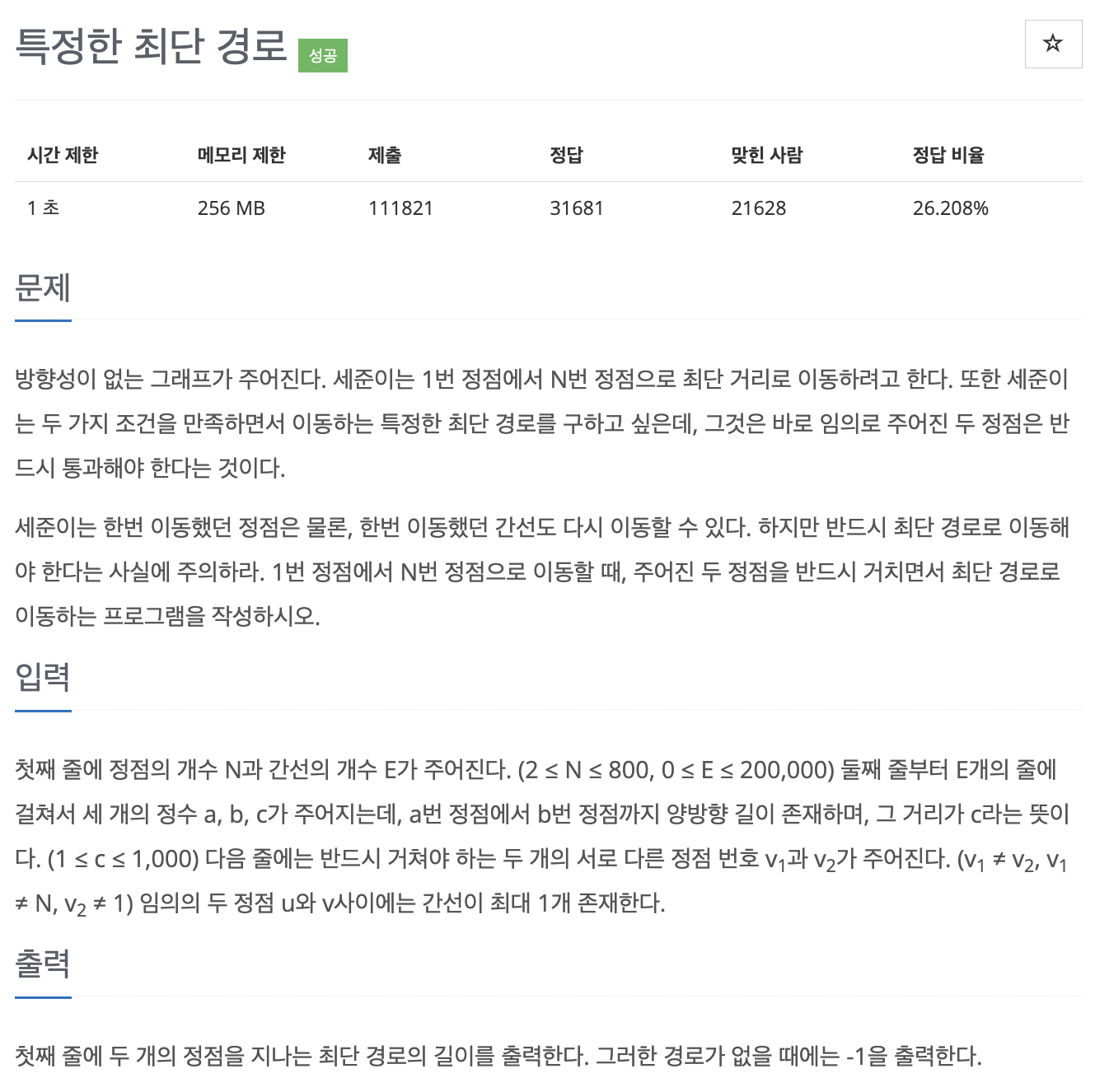 첫째 줄: 정점의 개수 N (2 <= N <= 800), 간선의 개수 E (0 <= E <= 200,00)