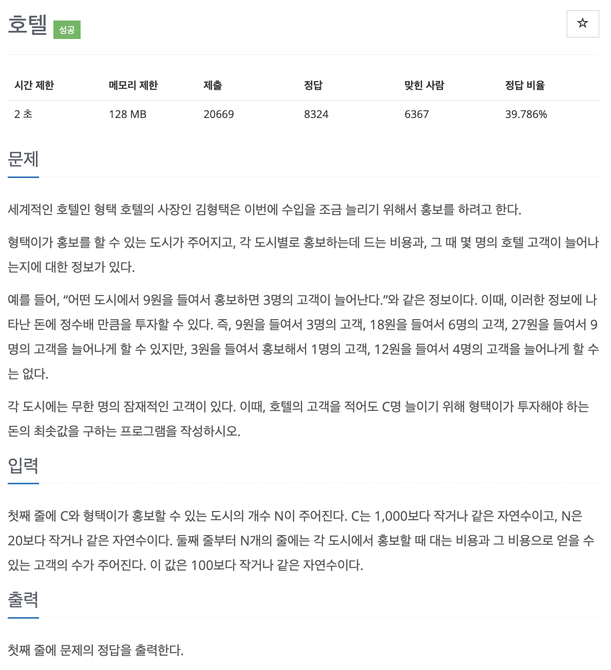 둘째 줄 ~ N개 줄: 도시에서 홍보할 때 대는 비용, 그 비용으로 얻을 수 있는 고객 수 (<= 100, 자연수)