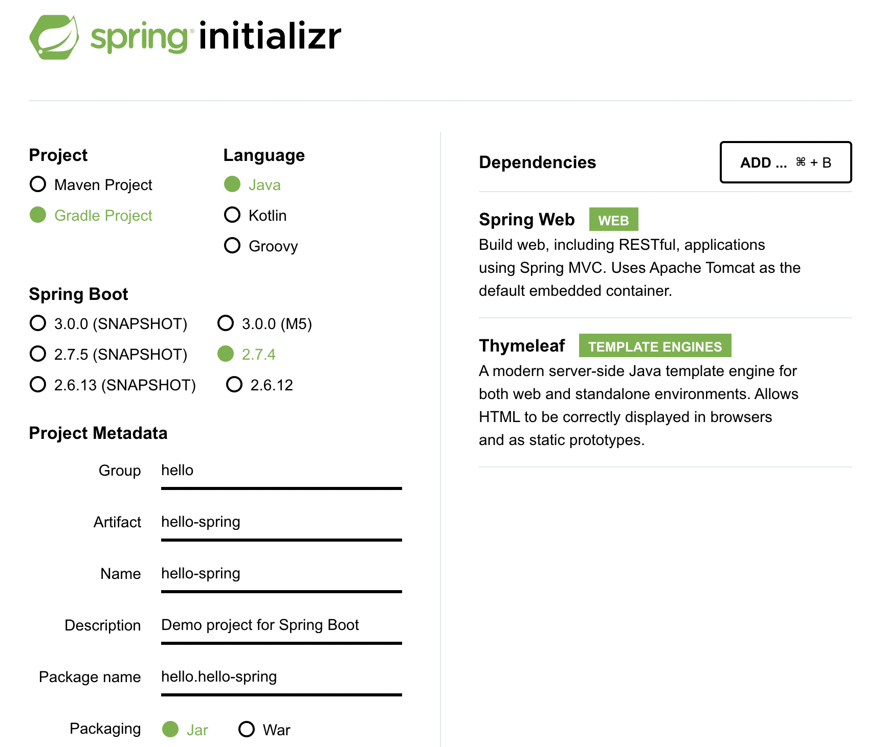 스프링 부트 스타터 사이트 -> 스프링 프로젝트 선택