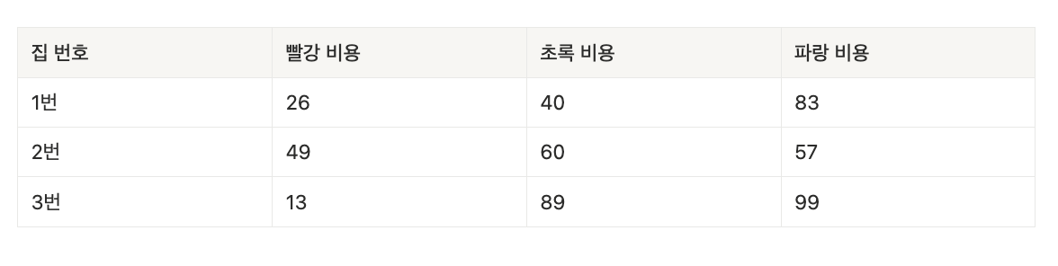 - `cost[i][j]`: i번째 집을 색 j로 칠했을 때 드는 비용