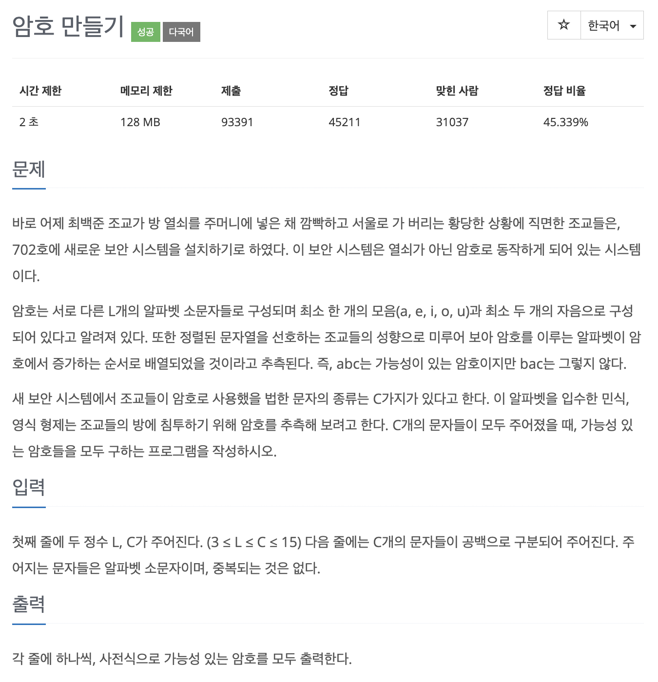 암호는 서로 다른 L개의 알파벳 소문자/ 최소 1개의 모음(a, e, i, o, u) + 최소 2개의 자음으로 구성