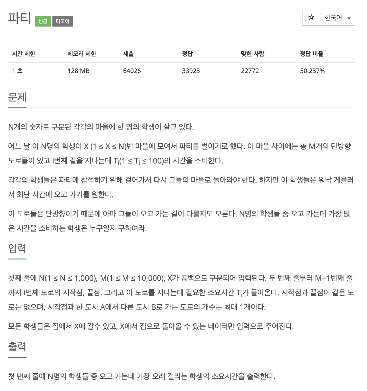 N개의 숫자로 구분된 각각의 마을에 한 명 학생 살고 있음/ N명의 학생이 X번 마을에 모여서 파티를 벌이기로 함