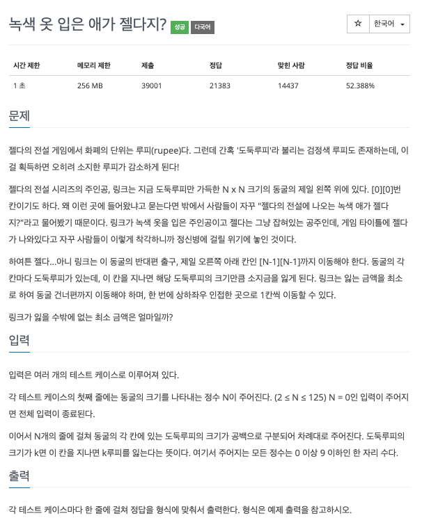 각 칸에 적힌 비용(루피) 최소로 하면서 (0, 0) -> (N-1, N-1)까지 이동 = 최단 경로 문제