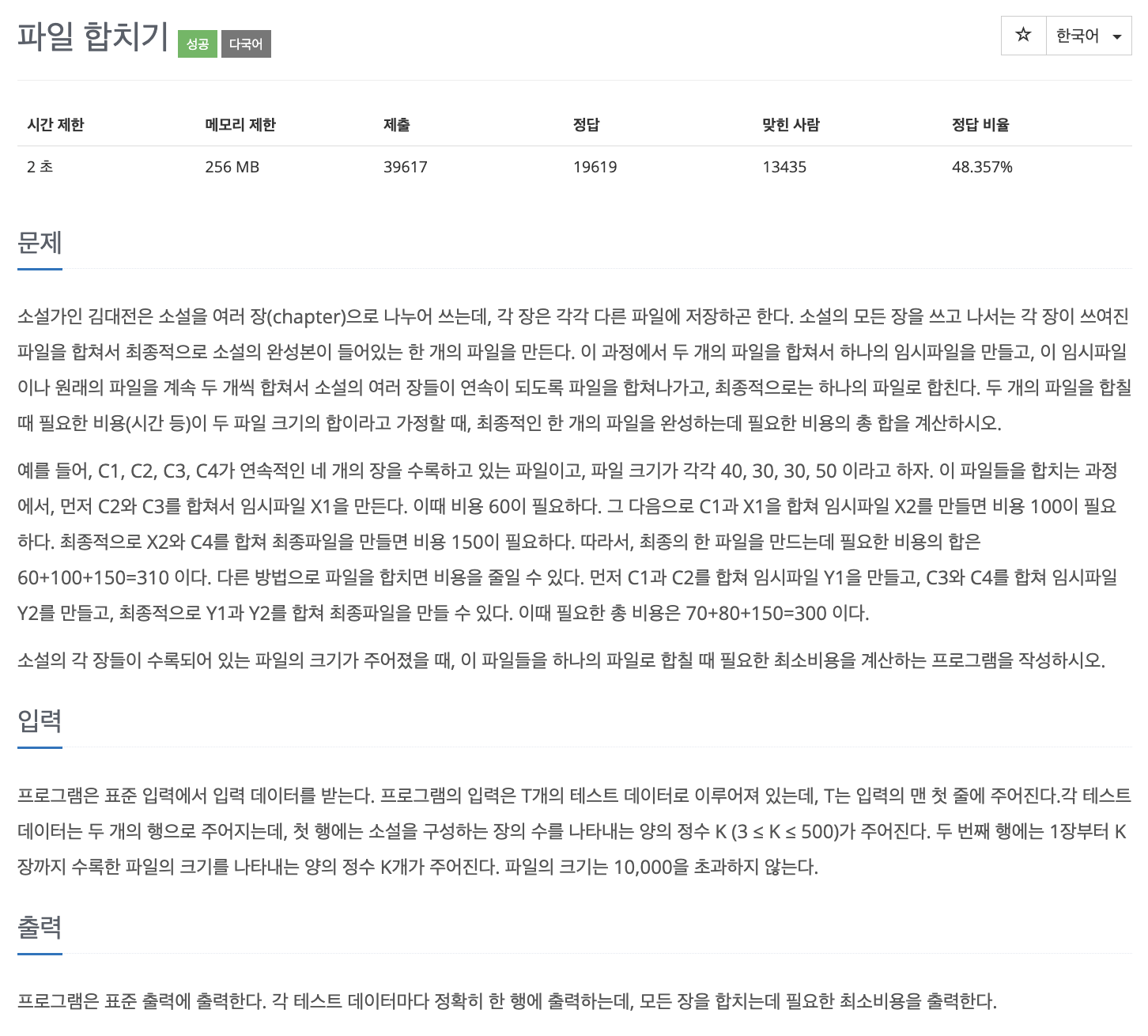 출력: 모든 장을 합치는데 필요한 최소 비용