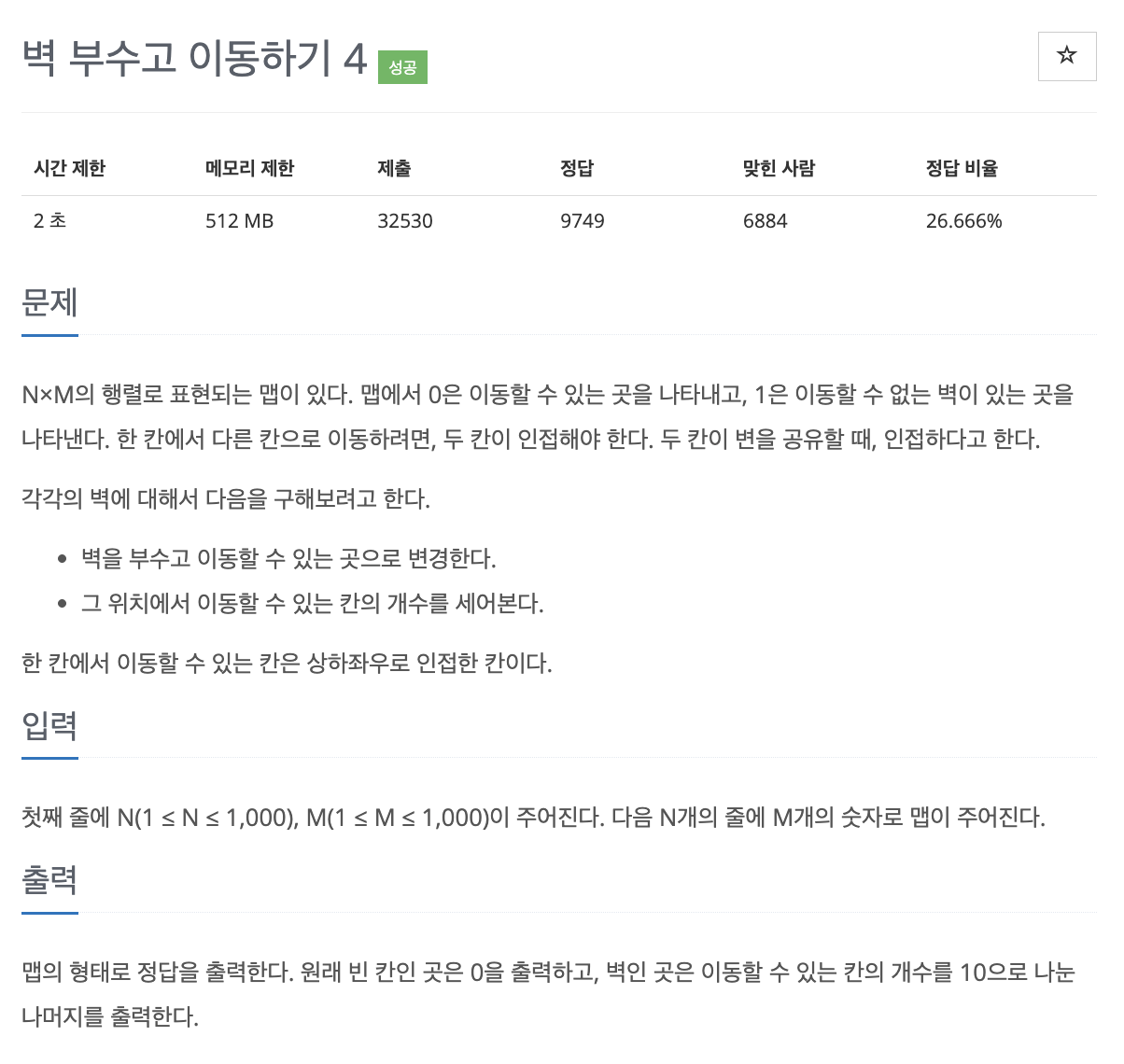 출력: 맵의 형태로 정답 출력/ 원래 빈 칸인 곳은 0, 벽인 곳은 이동할 수 있는 칸의 개수를 10으로 나눈 나머지