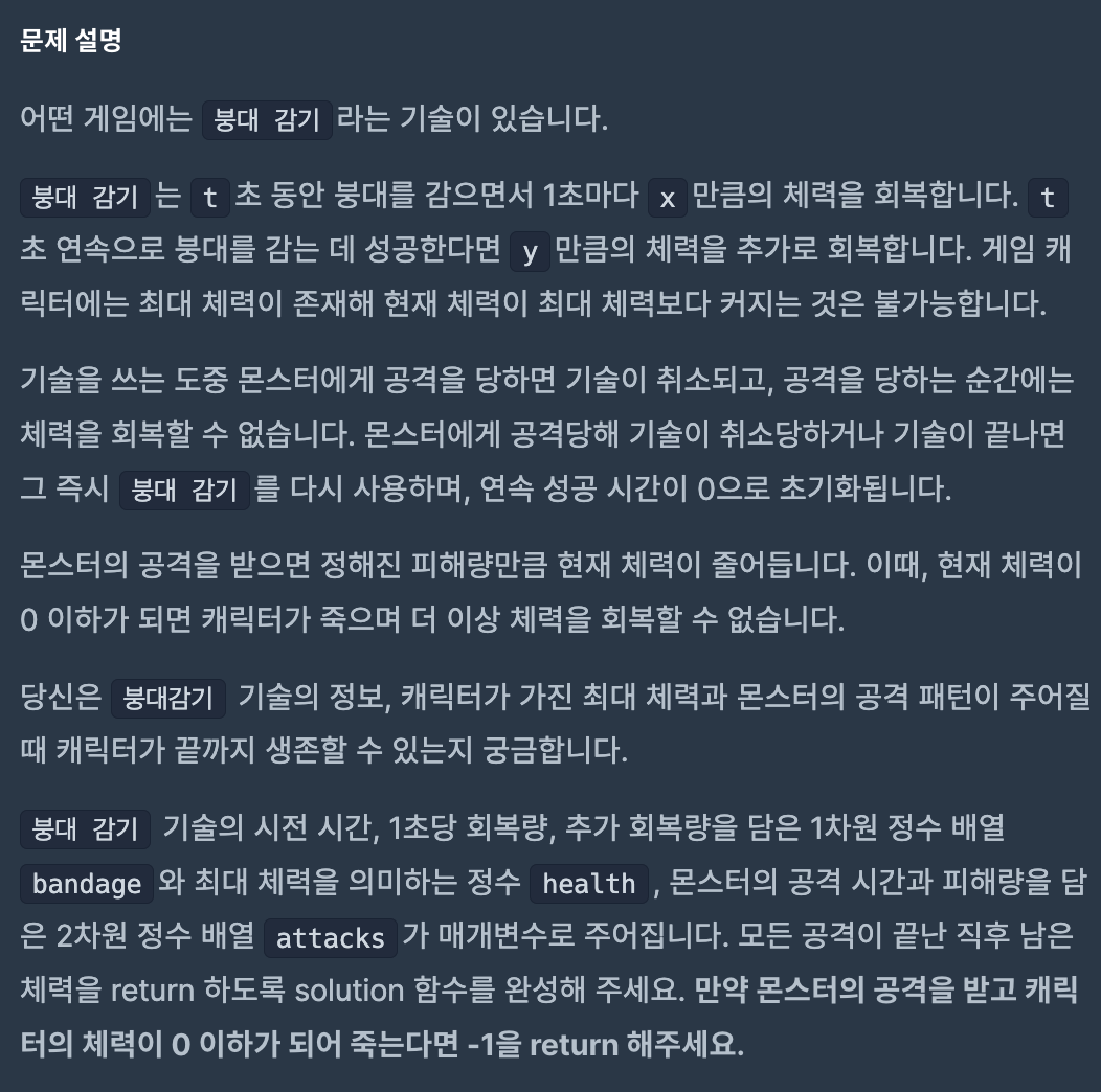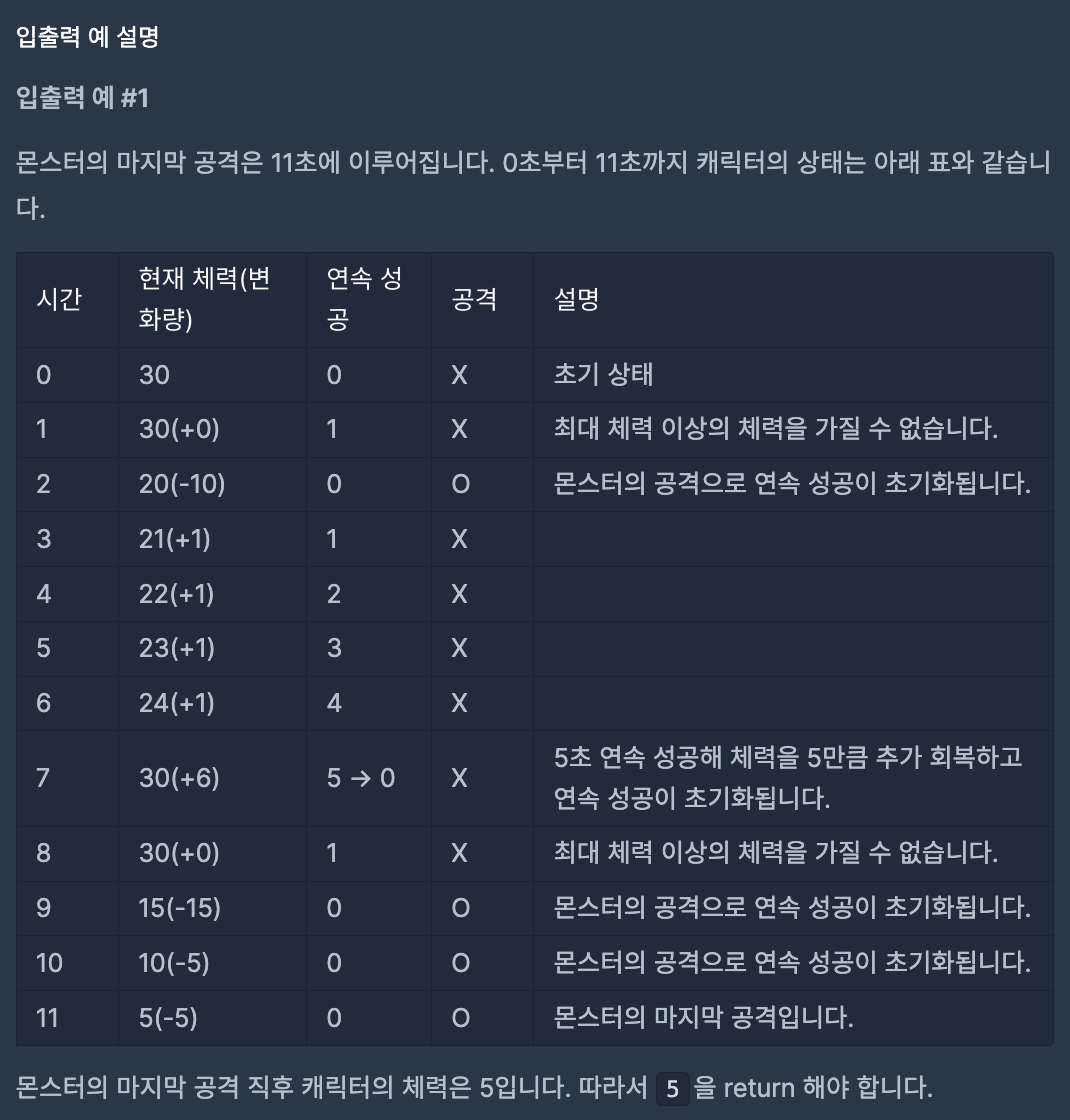 public int solution(int[] bandage, int health, int[][] attacks) {