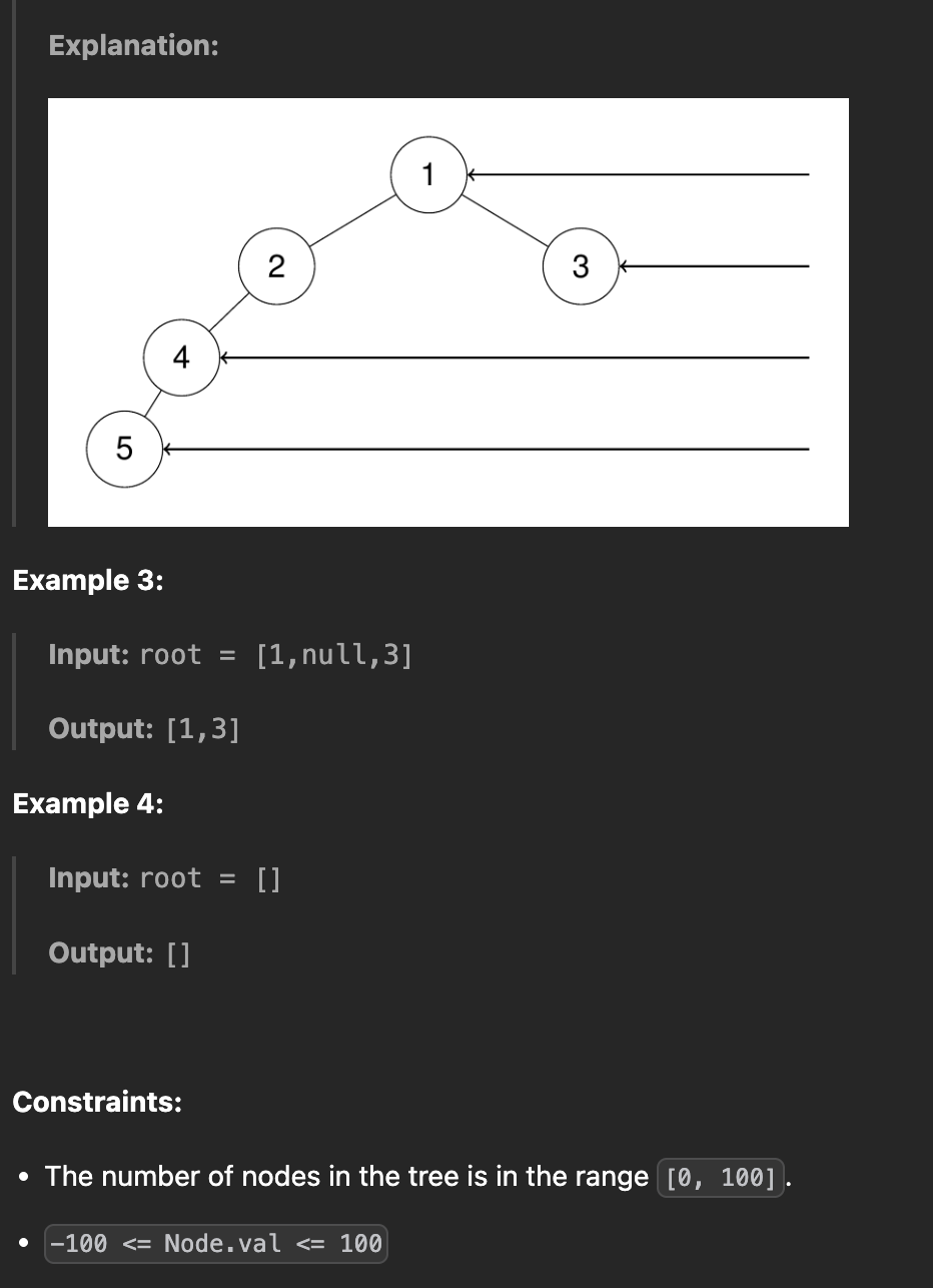 이진 트리의 루트 노드가 주어졌을 때, 트리를 오른쪽에서 바라봄