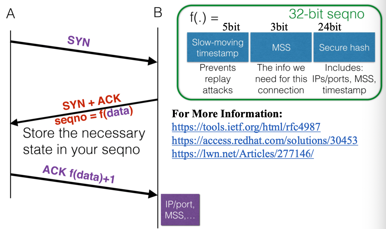 - After a server receives a SYN packet, it calculates a keyed hash (H) from the information in the packet using a secret key that is only known to the server