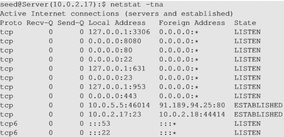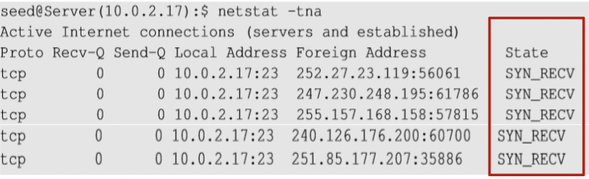 Using netstat command, we can see that there are a large number of half-open connections on port 23 with random source IPs.