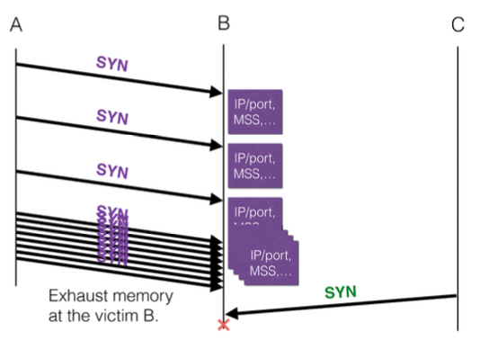 / queue 가득 채워 더 이상 새로운 half-open connection에 대한 TCB 저장할 공간 제거