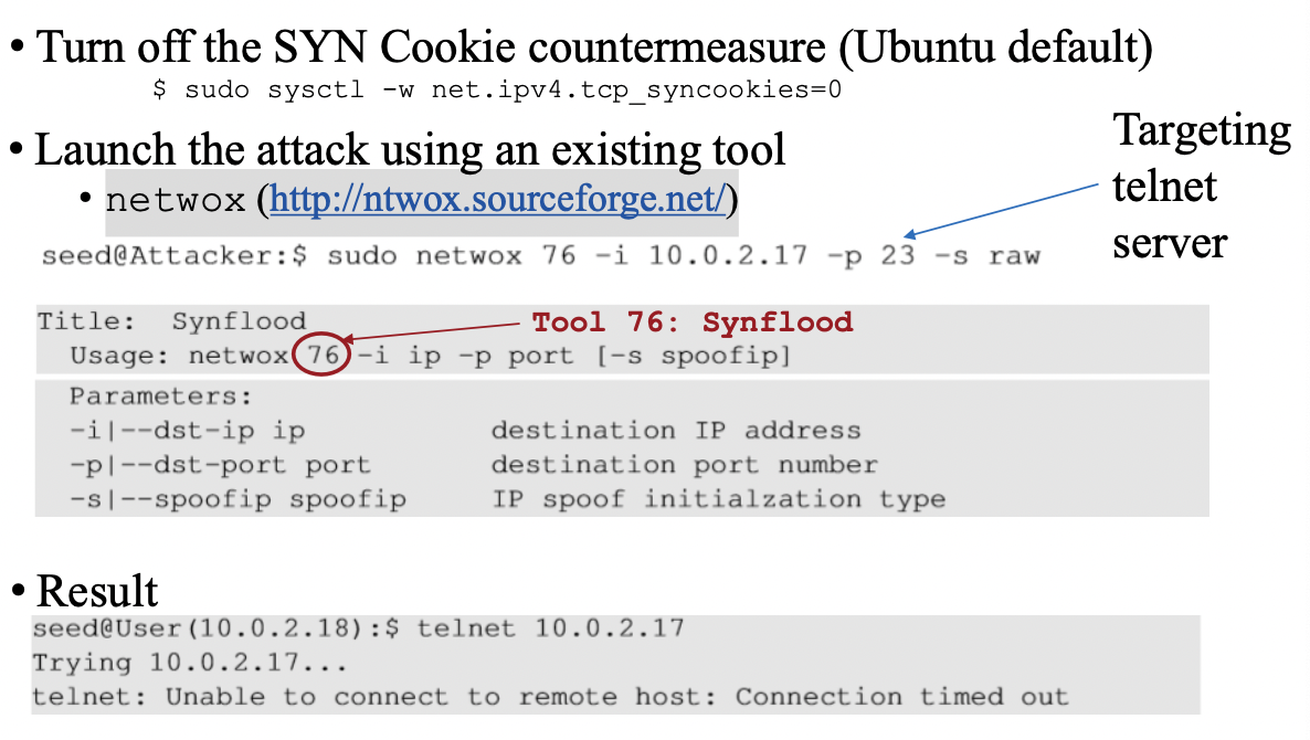 - We tried to use Scapy program to construct and send SYN flooding packets. Unfortunately, Scapy is too slow