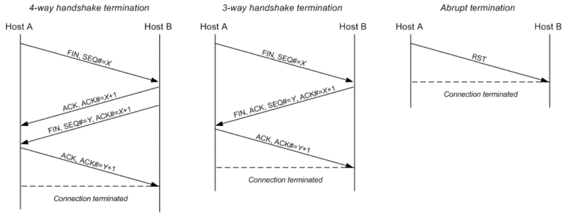 A sends out a “FIN” packet to B. B replies with an “ACK” packet. This closes the A-to-B communication. Now, B sends a “FIN” packet to A and A replies with “ACK”.