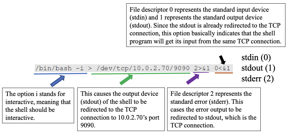 - The shell program uses one end of the TCP connection for its input/output and the other end of the connection is controlled by the attacker machine.