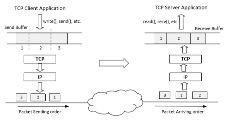 - 수신 buffer에 도착한 패킷들: 순서 정렬 -> data stream (no boundary)형태로 application으로 전달