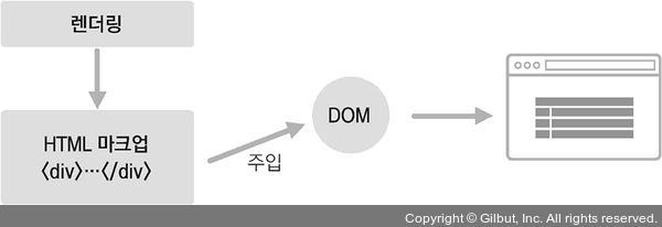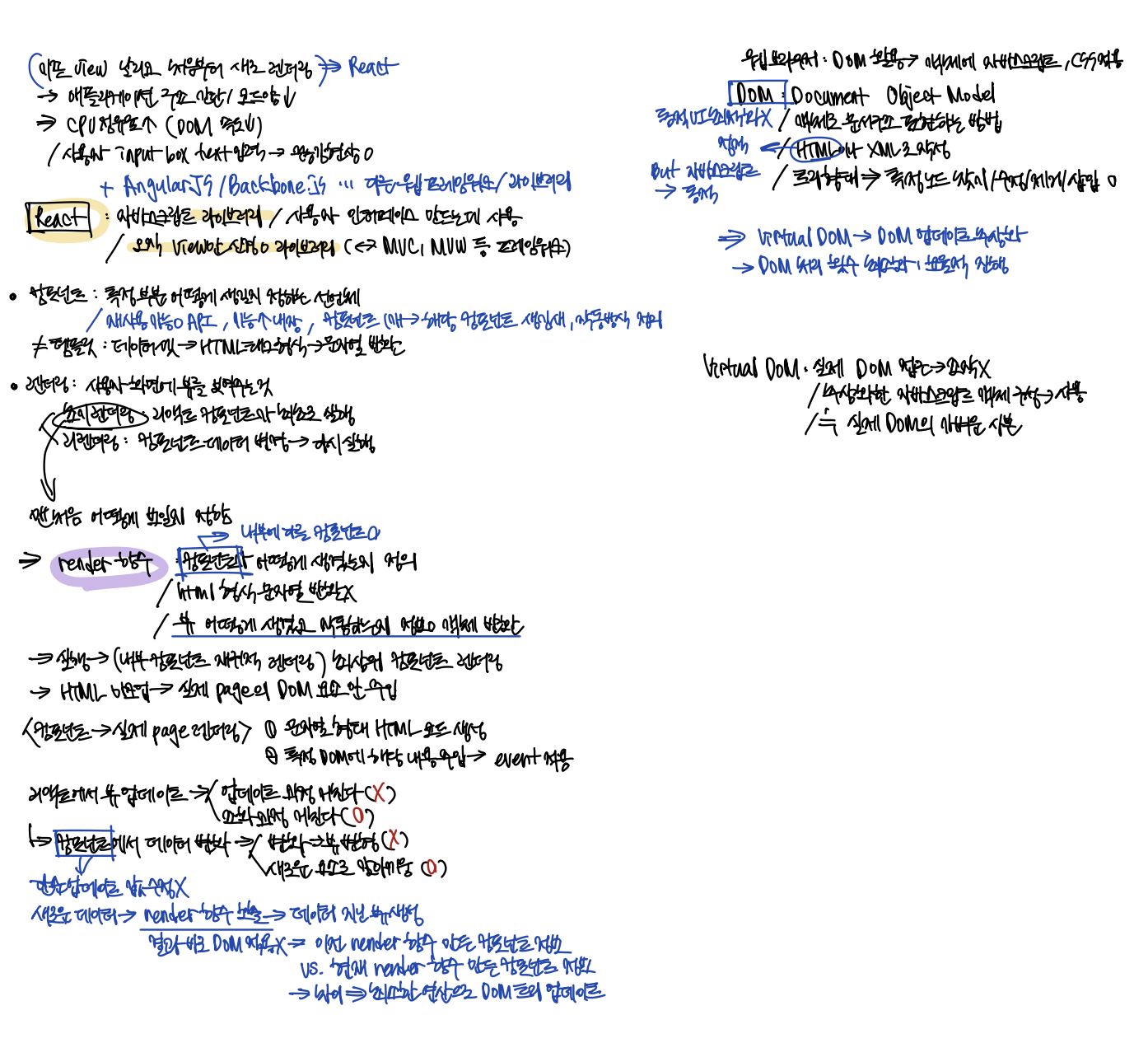 -> 웹 브라우저) CSS 다시 연산, 레이아웃 구성, 페이지 리페인트 => 시간 ↑ - Virtual DOM 방식 사용 -> DOM 업데이트 추상화 => DOM 처리 횟수 최소화(업데이트 처리 간결성)